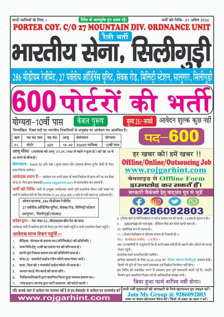 Recruitment for the post of:-  Porter Bharti-2026 : Post-600