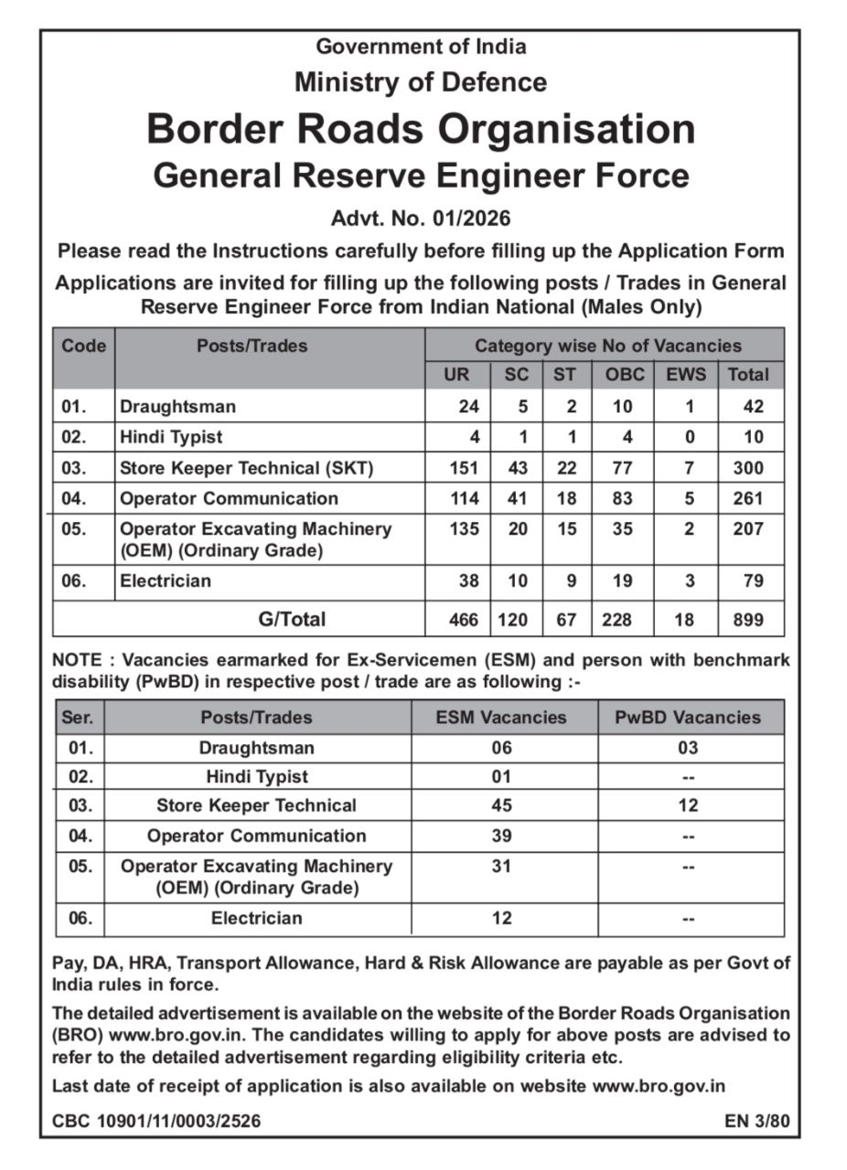 BRO Recruitment-2026, Advt 01/2026 Notification : The Border Roads Organisation (BRO) under the Ministry of Defence, Government of India, has released a new recruitment notification through Advertisement Number 01/2026 for multiple posts in the General Reserve Engineer Force (GREF). The BRO Recruitment Advt 01/2026 Notification has been released in the 18-24 April 2026 Employment Newspaper (officially released by the Govt. of India). The exact dates of the application, dates, fees, eligibility, etc., will be released soon on the official website of BRO, bro.gov.in.