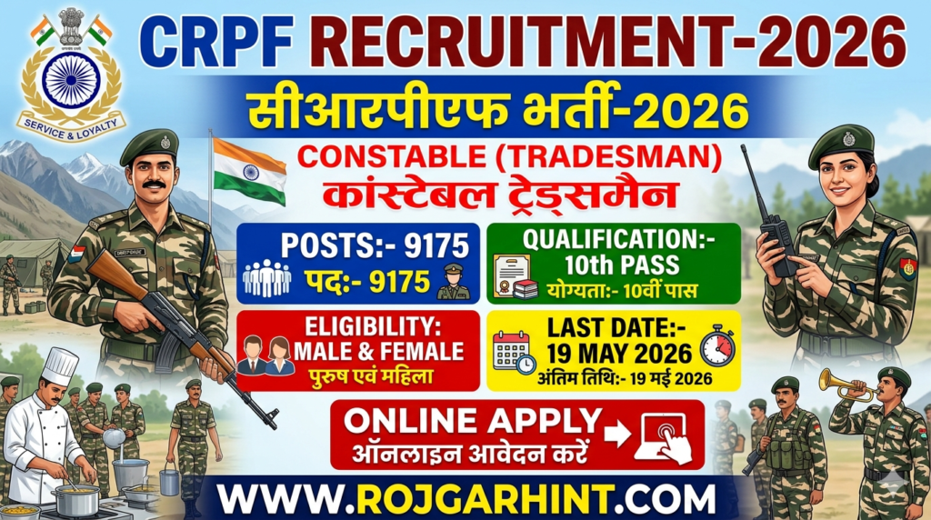 CRPF Constable (Tradesman) Recruitment-2026 Notification PDF: The Central Reserve Police Force (CRPF) has released a fresh notification for Constable (Technical & Tradesmen) Recruitment 2026. This recruitment is a great opportunity for candidates who want to join the Central Armed Forces, as a total of 9175 vacancies have been announced for various trades. The CRPF Tradesman Recruitment 2026 Notification has been released on 8 April 2026, and the online applications are invited from 20 April 2026 to 19 May 2026. Candidates will be selected through multiple stages, including PET, PST, CBT, Trade Test, Document Verification, and Medical Examination. The recruitment will be conducted on a state-wise domicile basis, so candidates must ensure they apply carefully with the correct state details.