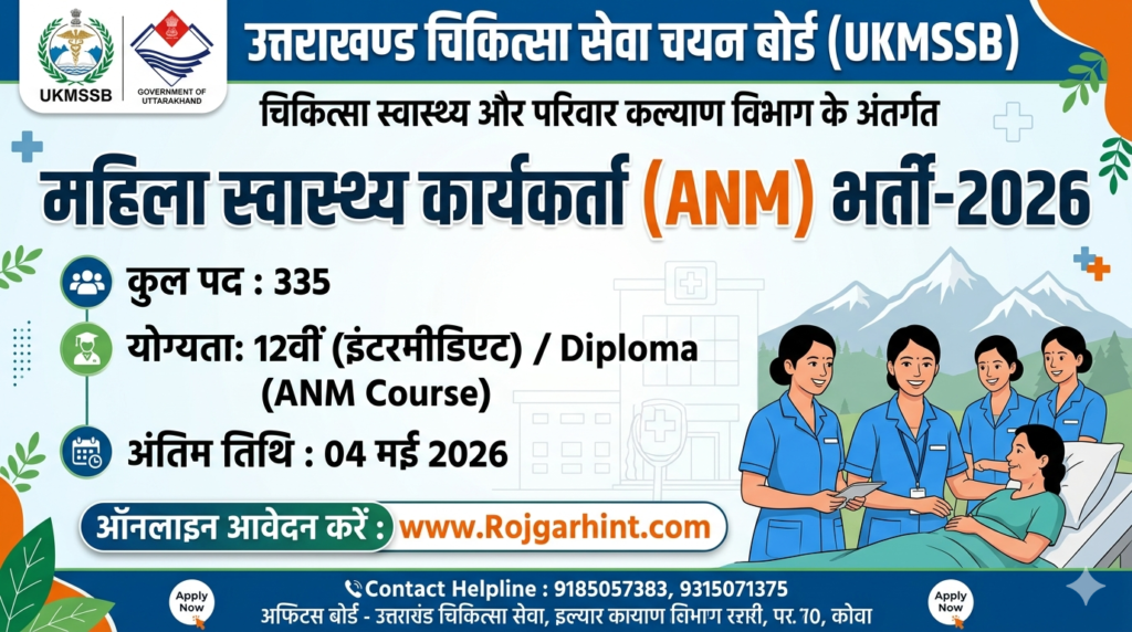 UKMSSB-ANM, Recruitment-2026: The Uttarakhand Medical Service Selection Board (UKMSSB) has released a revised notification for the Recruitment of 335 Female Health Worker/ ANM (Auxiliary Nurse Midwife) posts under the Health Department. This recruitment drive is being conducted for a total of 335 vacancies, and eligible female candidates can apply online within the given dates. The UKMSSB ANM Recruitment 2026 Notification has been released on 15 April 2026, and the online applications are invited from 21 April to 4 May 2026. The eligible candidates can apply online from the website ukmssb.org or ukmssb.in.
