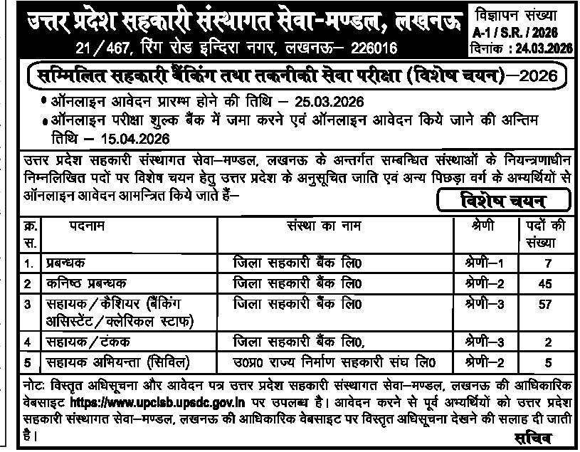 UP Cooperative Bank Recruitment 2026: The U.P. Co-operative Institutional Service Board (UPCISB), Lucknow has officially released the notification for Combined Co-operative Banking and Technical Services Examination (Special Recruitment) 2026. This recruitment drive offers a great opportunity for candidates looking to build a career in the banking and technical sector under cooperative institutions in Uttar Pradesh. As per the official notice, the online application process will begin from 25 March 2026, and interested candidates must complete their application and fee submission before the last date. This recruitment is specifically conducted under Special Recruitment, targeting eligible candidates from reserved categories.